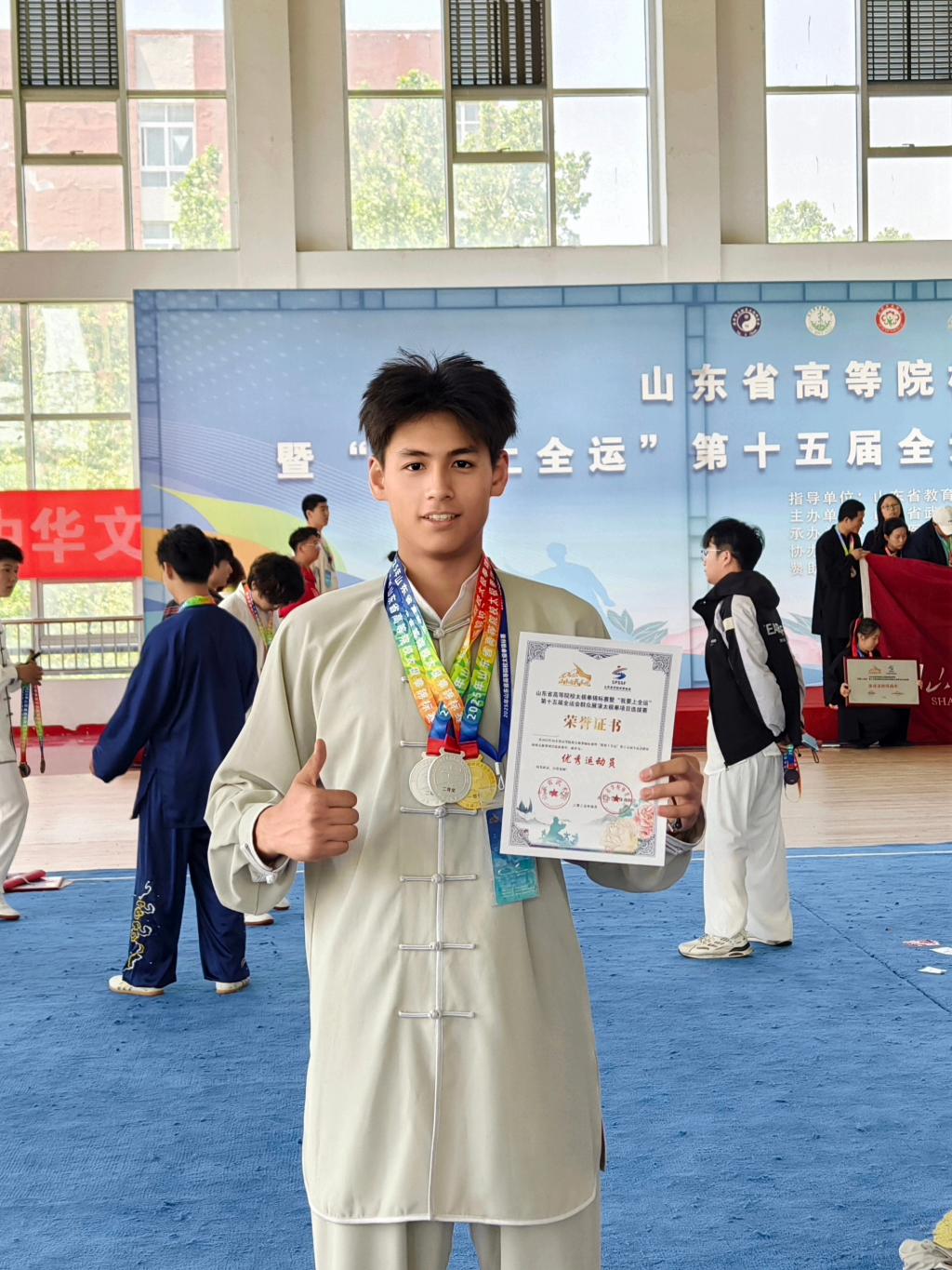 在竞技赛场上,他不断突破自我:在校运会上夺得1金1银;2024年首战山东省高校太极拳锦标赛即获两项省级二等奖,同年在全国太极拳公开赛(山东赛区)、山东省全民健身运动会太极拳比赛中再添四项省级二等奖,获评中国大学生武术锦标赛“优秀运动员”;2025年在山东省学生武术锦标赛中斩获男子太极传统器械第七名、第八名及男子一类拳第八名的佳绩,从校内赛场到省级、全国舞台,稳步实现自我超越。在校园体育建设中,他主动担当,牵头组织趣味运动会、“一二・九”马拉松等特色活动,带领武术社团传承中华传统体育文化,以自身行动带动同学们走出宿舍、走向操场,推动永不服输、持续进取的体育精神在校园落地生根。